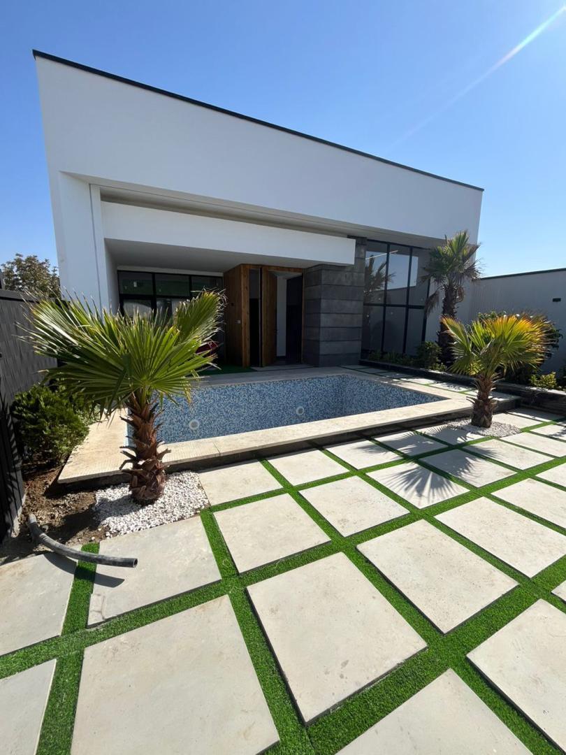 ویلا با زبان طراحی معاصر ساخته شده؛ سقف تخت، خطوط معماری صاف و ترکیب متریال‌های سفید و خاکستری تیره نمایی لوکس و کم‌نظیر به ساختمان داده است. پنجره‌ها و درهای کشویی شیشه‌ای ارتباط چشم‌نوازی میان فضای داخلی و حیاط ایجاد کرده‌اند و نور طبیعی روز را به‌خوبی به داخل هدایت می‌کنند. استخر روباز با طراحی مستطیلی و سیستم جت آب داخل بدنه، جلوه‌آبگیر و فضای تفریحی خصوصی فراهم کرده است. محوطه‌بندی با اسلب‌های بتنی مربع و نوارهای چمن مصنوعی حس مینیمالیستی و هم‌زمان سبز بودن را منتقل می‌کند.