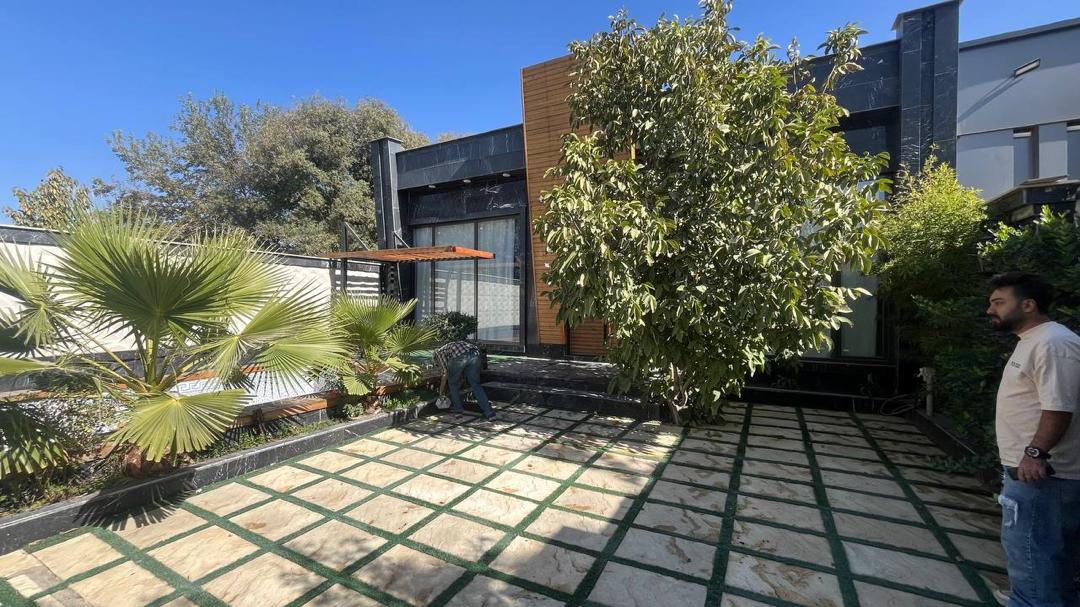 - حیاط با طراحی شبکهای از سنگهای مربعی و فضای سبز بین آنها ظاهری مرتب و مدرن دارد که در تصاویر ویلا مشخص است.